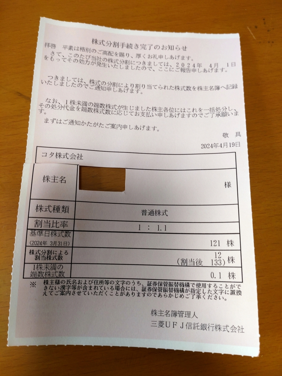 このお手紙は株式分割なので、実質的には評価額が増えるんだよね。毎年、1.1倍に株式数が増えてくから、勝手に増殖してくれる。取得してから、これが3回目かな。